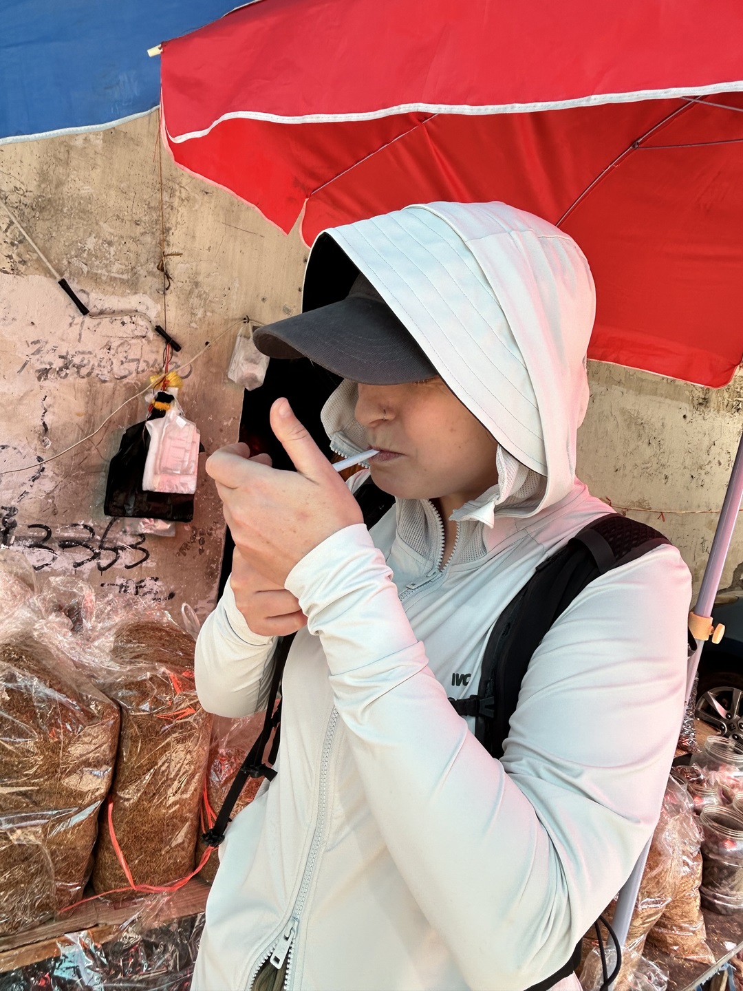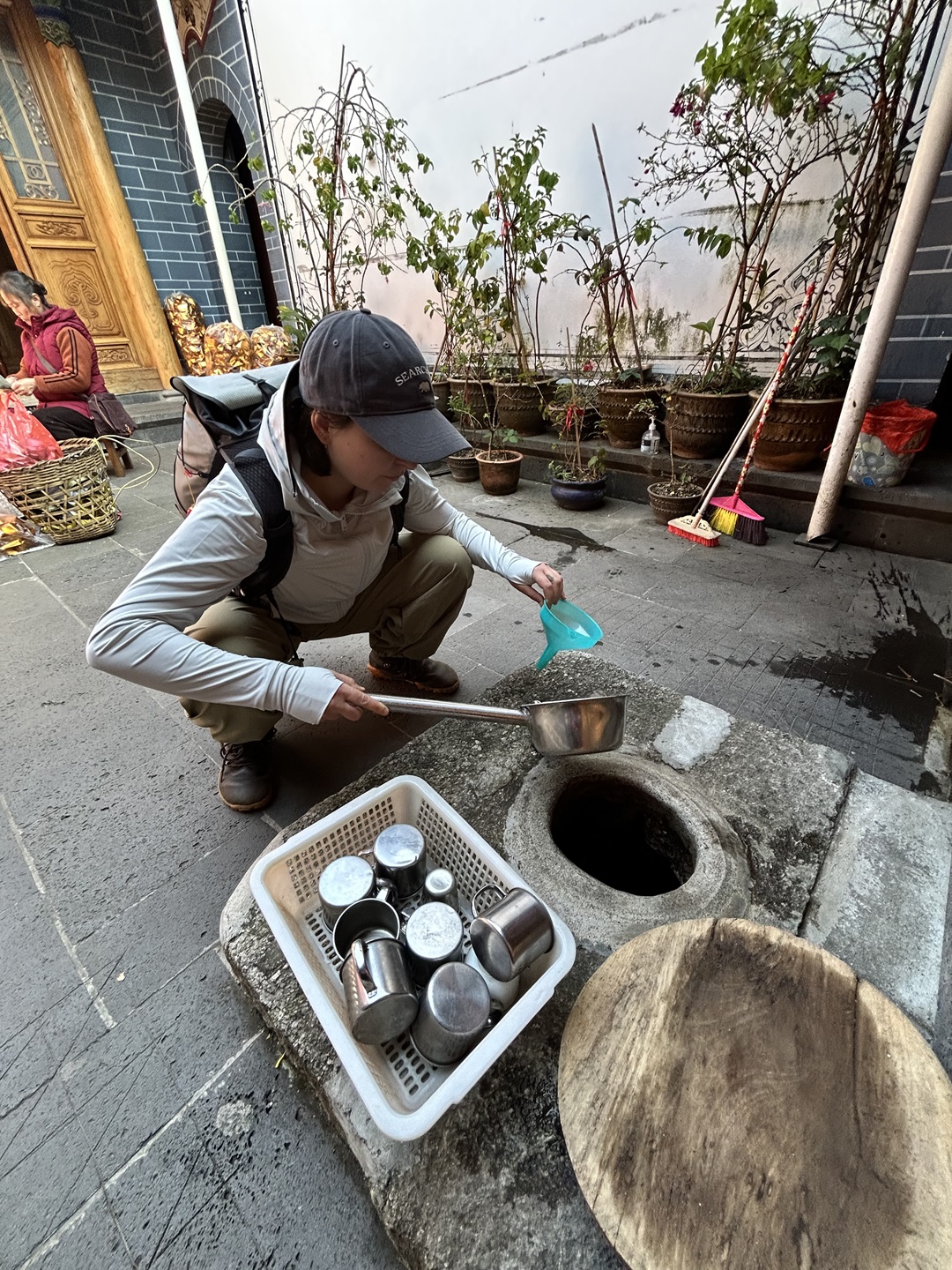 Je suis nourrie d’innombrables rencontres depuis le début de ce périple. Voyageurs ou résidents, ces personnes de tout horizon ont le point commun d’être Chinois, à l’exception de mes premiers amis mongoles, et heureux de m’accueillir dans leur pays. J’ai croisé quelques rares occidentaux dans les lieux les plus fréquentés, nos échanges se sont limités à un petit signe de tête, un sourire, ou le plus souvent à l’indifférence totale. Je n’ai moi-même pas spécialement cherché le contact et cette apathie réciproque me convient. Les gens de manière générale aiment venir me parler et me posent de nombreuses questions, parfois indiscrètes, auxquelles je réponds plutôt amusée. Il n’est pas rare que des petits attroupements se créent et je fais de mon mieux pour suivre la conversation avec mon vocabulaire restreint. On rigole beaucoup, l’ambiance est légère et bienveillante. Certains m’observent écrire à l’ordinateur par exemple, étendre ma lessive, débloquer un vélo pour m’en aller ou manger. Mes affaires sont curieusement observées et il n’est pas rare qu’on me demande photos ou TikTok. D’abord gênée, je commence à avoir l’habitude et l’ambiance bon enfant me plaît bien, toujours très respectueux et jamais insistant. Le moment révolu, chacun passe rapidement à autre chose.